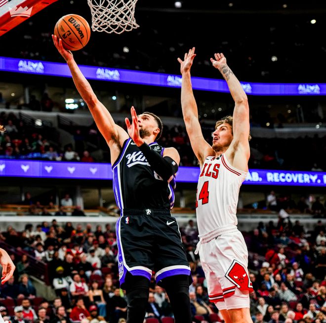少爺在第三節(jié)的效率才下滑,一個三分與一次突破不中,依靠罰球拿到2分,三節(jié)打完少爺?shù)梅诌€是上雙了,但這一節(jié)國王被公牛打了一波39-27大比分落后了。施羅德因為進攻狀態(tài)太差決勝時刻直接被棄用了(28分鐘9中2拿5分7助攻)