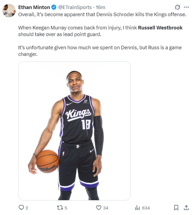 美記Ethan Minton:總的來說,施羅德對國王的進攻造成巨大影響他是一個拖累。當基根穆雷復出后,我認為威少應該成為球隊的先發(fā)控球后衛(wèi),盡管國王在施羅德身上花了很多錢,但很明顯威少才是一個可以改變比賽的球員。